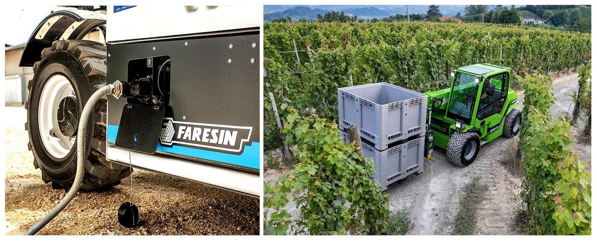 The company Dieci from Montecchio Emilia (RE) lists the Mini Agri-e in its catalog, equipped with one or two lithium batteries with a maximum capacity of up to 44 kWh, rechargeable using 3 different options, at the column, or via 220 or 380 V industrial sockets. Equipped with two motors, one for traction and the other serving the hydraulic system (19 and 22 kW respectively), it offers a maximum lifting height of 5.7 m, a capacity of 2,600 kg and a travel speed of up to 24 km/h. It can be managed with 3 different driving strategies, aptly described by their names: Standard, Eco and Power. Another model with similar lifting performance to the previous one is that offered by Faresin from Breganze (VI): it has an 80V battery pack with 24, 32 or 43 kWh capacities, two motors (30 kW for traction and 18 kW for hydraulic services) and a maximum speed of 12 km/h. Its overall mass is 4,800 kg, with a turning radius of only 3.25 m. Of interest are its multiple charging options, with the manufacturer stating that it takes just 3 hours to charge the battery using the integrated rapid charger.