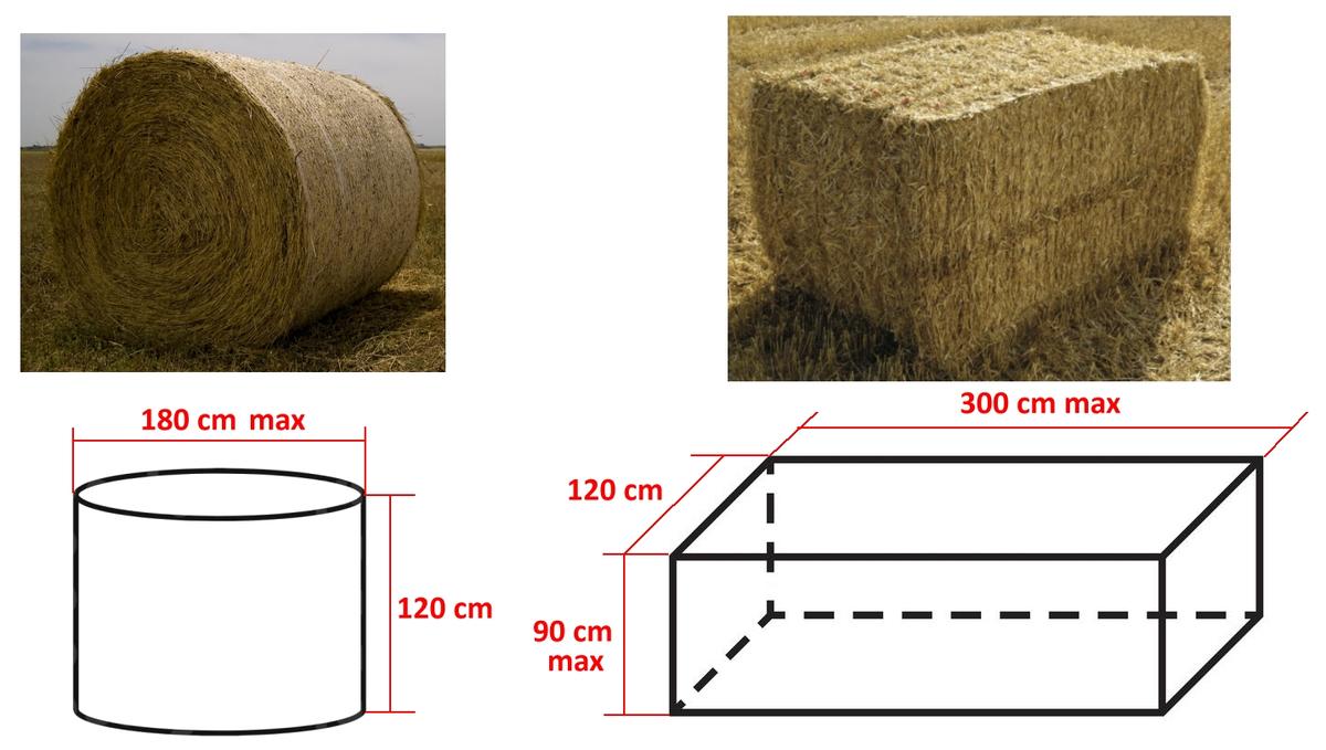 A fronte di una larghezza pressoché standard di 120 cm, le rotoballe hanno infatti solitamente diametri che vanno da 120 a 180 cm, mentre per le grandi balle prismatiche (o parallelepipede) la variabilità è ancora più ampia, soprattutto per ciò che concerne la loro lunghezza. Un “formato” piuttosto popolare è 240x70x120 cm (LxAxP), ma le big baler di maggior capacità lavorativa possono arrivare a confezionare balle da 300x90x120 cm.