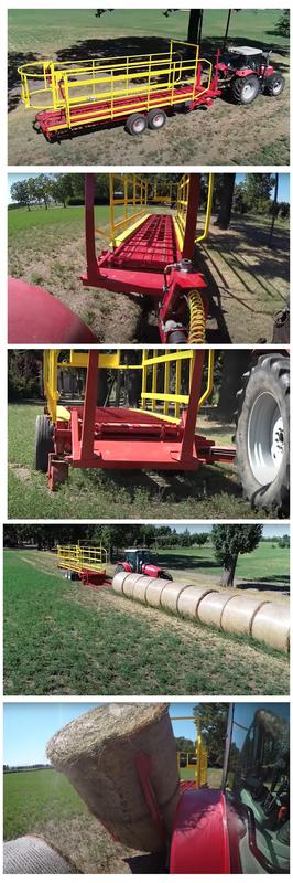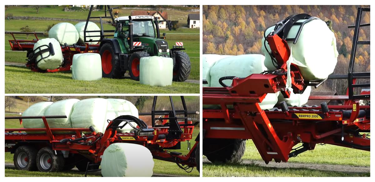 Se le rotoballe sono allineate in fila indiana, alcuni costruttori hanno messo a punto originali meccanismi per poter caricare più elementi in un’unica soluzione. In pratica, due semigabbie cilindriche collocate sui due lati di un pianale doppio sovrapposto ruotano lateralmente verso l’esterno di 180°, fino a terra; successivamente, con l’avanzamento del trattore si impegna ognuna delle due semigabbie con 4-5 balle che, quando sono a pieno carico, compiono il movimento opposto per il caricamento sul pianale superiore. Quest’ultimo viene sollevato (sempre idraulicamente) per far posto alle balle caricate nel piano inferiore, tramite la ripetizione della routine illustrata. In tal modo possono essere stoccate sul carro anche fino a 20 rotoballe, in modo da sfruttare adeguatamente la portata massima dell’attrezzatura, a tutto vantaggio dell’efficienza del trasporto. Se la rotoballa si presenta appoggiata al terreno su uno dei due lati piatti, in alcuni casi sull’attacco a 3 punti anteriore del trattore è montato un accessorio che provvede a ribaltare dolcemente la balla, quindi senza danneggiarla, anche nel caso sia fasciata con film plastico.