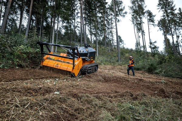 L'ultimo nato in casa FAE, il modello RCU45, fa il suo debutto ufficiale ad Agritechnica. Si tratta di un cingolato radiocomandato ultracompatto per la gestione professionale della vegetazione su terreni di difficile accesso o con pendenze particolarmente elevate, e che richiedono mezzi in grado di garantire all’operatore condizioni di massima sicurezza. Il nuovo veicolo è spinto da un propulsore Yanmar da 44 Cv, Common Rail a iniezione elettronica. Il sottocarro heavy duty è equipaggiato con un sistema di tensionamento automatico del cingolo in gomma che permette al mezzo di lavorare anche in presenza di pendenze fino al 55°, mentre la doppia trasmissione idrostatica gestisce sia la trazione che le attrezzature ad essa connesse. La gestione del cingolato RCU45 avviene per mezzo di un radiocomando ergonomico, con frequenza di trasmissione a 2,4 GHz e di un ampio display da 4,3 pollici, attraverso il quale è possibile controllare tutte le funzioni del veicolo e della testata collegata, grazie ai tasti funzione personalizzabili dall’utente. Per regolare le diverse impostazioni della macchina, o per movimentare il cingolato qualora il telecomando non fosse disponibile, l’operatore può utilizzare anche l’App sviluppata dal costruttore trentino per i sistemi iOS (Iphone) e Android. Inoltre, l’applicazione permette di effettuare la diagnostica in caso di problematiche e di ricevere notifiche relative agli interventi di manutenzione. L’RCU45 può essere abbinato a due attrezzature. La prima è la trincia forestale BL0/RCU che può sminuzzare rami e legno fino a 10 cm di diametro, e che è equipaggiata con un rotore a lame fisse e con tecnologia Bite Limiter per incrementare la produttività. La seconda è la testata PML/RCU una trincia a martelli mobili, che tritura erba e piccoli arbusti, fino a 5 cm di diametro. L’RCU45 può essere dotato di verricello a controllo elettronico con capacità di traino di 1,1 tonnellate.