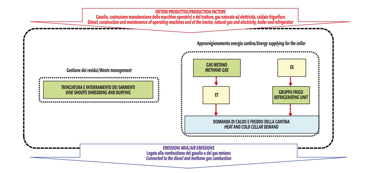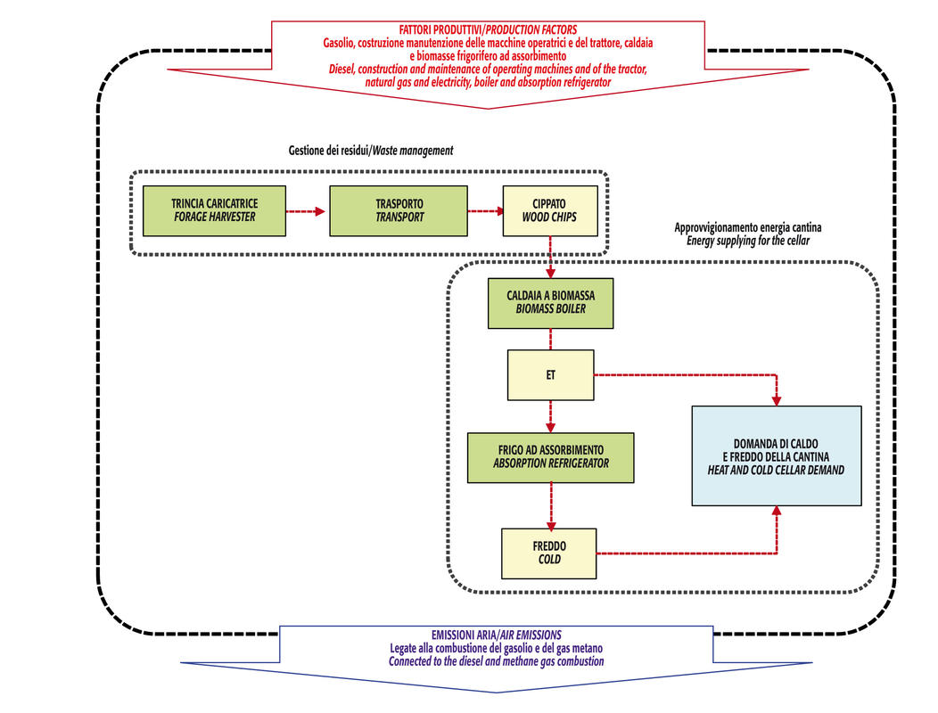 Viceversa, nel secondo scenario i residui vengono raccolti con una trinciacaricatrice, e il cippato prodotto alimenta una caldaia a biomassa, situata nei pressi della cantina. Il calore prodotto va in parte a provvedere ai fabbisogni termici della cantina e in parte ad alimentare un gruppo frigorifero ad assorbimento, in cui si sfrutta il calore di dissoluzione di un soluto (ammoniaca) in un solvente (acqua), ciclicamente concentrato e diluito. In questo caso, pur con una gestione in campo dei sarmenti più articolata, è possibile far fronte a parte dei fabbisogni energetici della cantina, evitando il consumo di combustibili fossili.