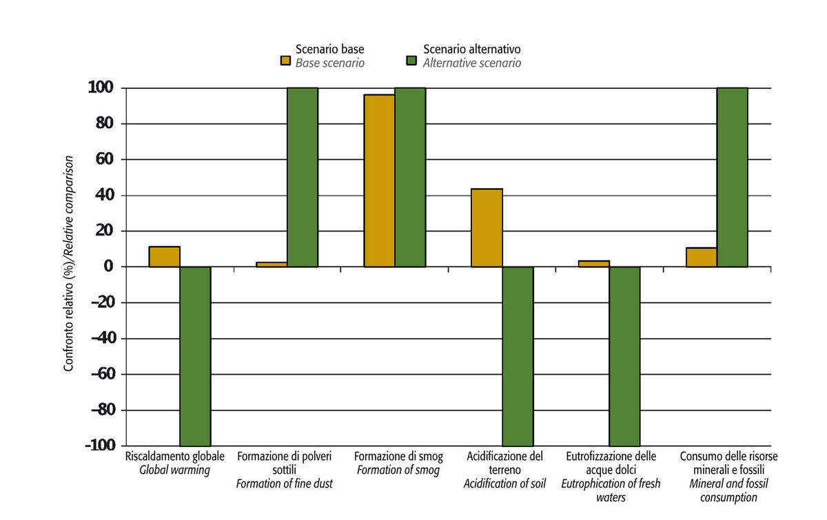 Ad esempio, per il riscaldamento globale lo scenario base causa un impatto sull’ambiente mentre quello alternativo comporta un notevole beneficio. Per la formazione di polveri sottili entrambi gli scenari danneggiano l’ambiente (i valori sono positivi), ma l’impatto dello scenario base, rispetto a quello alternativo, è inferiore di ben il 97%.