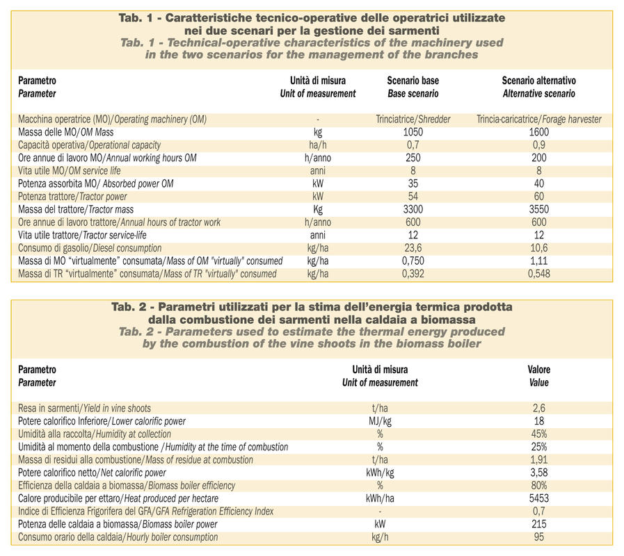La Tabella 1 riporta la caratteristiche delle macchine operatrici impiegate nei due scenari: oltreché sulla loro massa, per la valutazione ambientale il valore “virtualmente” consumato per ognuna di esse è stato calcolato in base alla vita utile e all’impiego annuo. La Tabella 2 illustra invece i valori dei principali parametri considerati per la stima dell’energia termica prodotta dalla combustione dei sarmenti nella caldaia a biomassa, e dell’energia termica sottratta (il “freddo prodotto”) dal gruppo frigorifero ad assorbimento (GFA). La potenza termica necessaria perché il GFA generi la stessa potenza frigorifera del classico frigorifero a compressione è pari a circa 215 kW e può essere calcolata considerando la potenza necessaria (150 kW) e l’Indice di Efficienza Frigorifera del dispositivo (parametro che indica quanta energia termica viene asportata consumando 1 kWh di calore). Per la generazione del calore necessario al funzionamento del GFA occorrono quindi 82 t/anno di sarmenti cippati, che possono essere ottenuti da 43,2 ha di vigneto, mentre per soddisfare i fabbisogni termici è necessario il sottoprodotto che è possibile raccogliere su ulteriori 10,3 ha. La superficie totale necessaria diventa quindi di circa 54 ha, corrispondenti al 9% dei vigneti che conferiscono l’uva alla cantina.