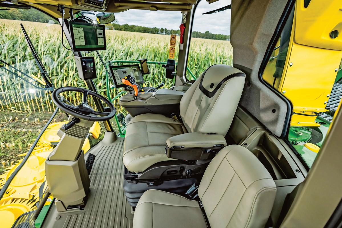 Prestazioni elevate e comfort di guida caratterizzano le nuove trince semoventi F8 e F9 di John Deere che fanno il loro debutto ad Agritechnica. I modelli introducono importanti upgrade a partire dalla cabina, più ampia e confortevole. Lo spazio interno è equipaggiato con soluzioni pratiche ed intelligenti per riporre in modo ordinato ogni oggetto. Il sedile ActiveSeat ruota di 16° a destra e sinistra per migliorare l’accesso e i movimenti nell’abitacolo. In opzione John Deere propone l’ActiveSeat II con comandi elettrici regolabili, riscaldamento/raffreddamento, massaggio e sospensione attiva che isola fino al 90% dei movimenti verticali. I montanti della cabina sono sottili e i finestrini panoramici, in modo da lasciare ampia visibilità all’operatore. Completa l’equipaggiamento il sistema di sterzo dell’assale posteriore con un raggio di curva di 6 metri.