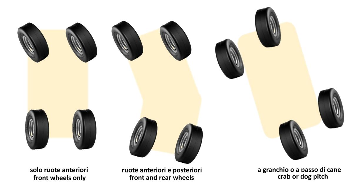 L’eccellente manovrabilità dei sollevatori telescopici è ulteriormente valorizzata dalle prestazioni dello sterzo, che può agire sulle 4 ruote. Come del resto anche su altre numerose macchine operatrici, le modalità di gestione sono di tre tipi, ovvero sterzata delle sole ruote anteriori, di tutte le 4 ruote e “a granchio” (o a “passo di cane”).