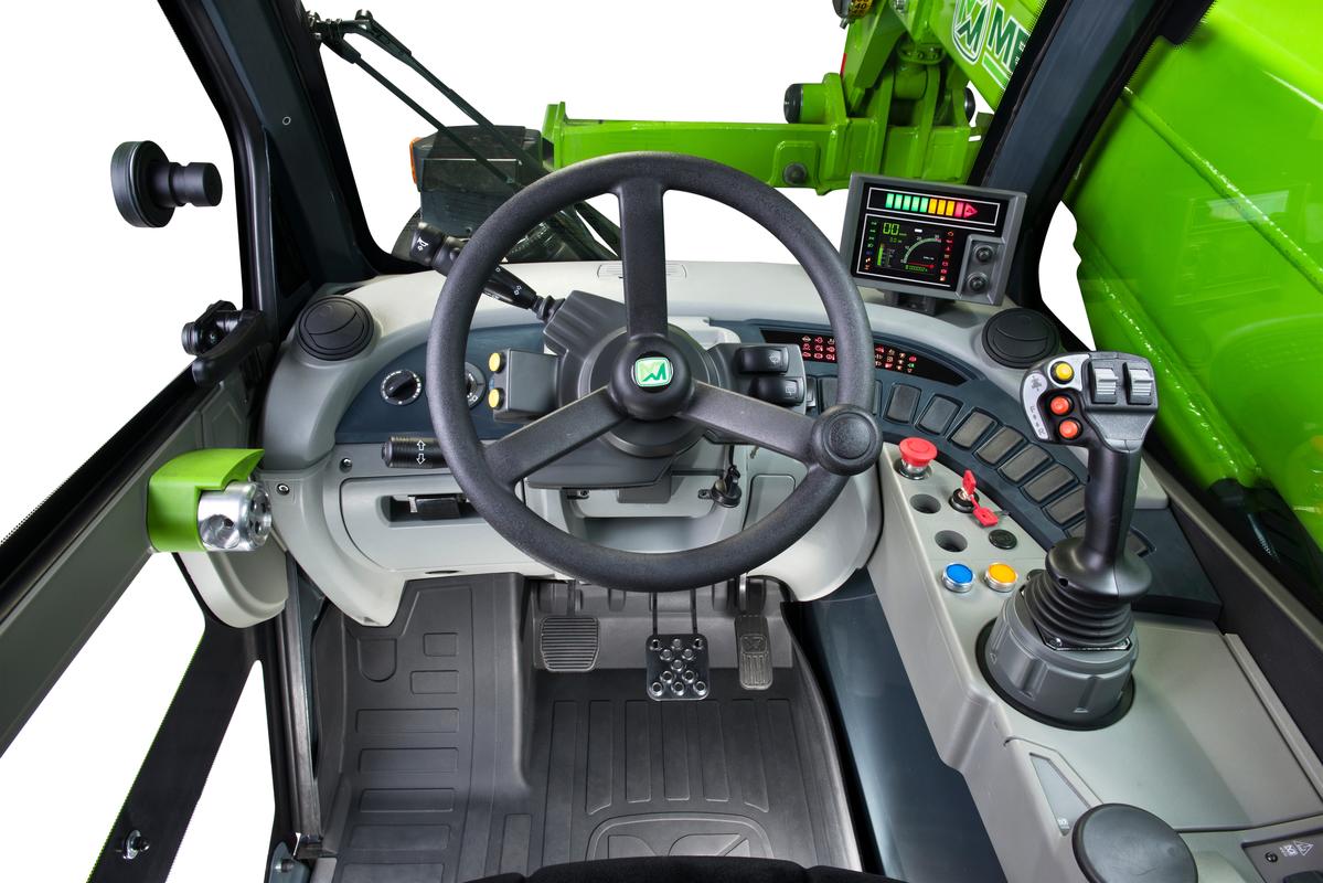 Per ovvie questioni di ingombro, sul sollevatore telescopico l’abitacolo ha normalmente un volume inferiore rispetto alla cabina solitamente installata sul trattore. Con una larghezza di 1,01 m, la cabina montata sui modelli di Merlo ottimizza il volume interno, comunque estremamente curato per il comfort acustico e soprattutto quello termico. L’impianto di climatizzazione può garantire una differenza di temperatura di ben 21° in condizioni estive (abbattendo la temperatura da 43° a 22°) e addirittura di 41° in quelle invernali (da -15° a 26°), grazie anche a ben 8 bocchette, di cui tre espressamente dedicate allo sbrinamento del parabrezza.