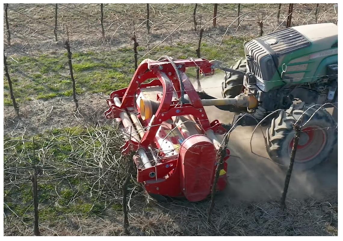 Trinciatura in campo. Si tratta dell’opzione tradizionale, da preferire quando è opportuno reintegrare il terreno depauperato di sostanza organica, a causa di ripetute coltivazioni intensive. La trinciatrice di sarmenti è un'attrezzatura portata o talvolta semi-portata dal trattore, generalmente collegata all’attacco a 3 punti e azionata tramite la presa di potenza, dotata di un rotore provvisto di coltelli a Y o più frequentemente di mazzette, per lo sminuzzamento contestuale dei residui di potatura e/o dell’erba eventualmente presente. La larghezza di lavoro varia solitamente da poco meno di un metro sino a 2,2 m. Alcuni modelli possono includere dispositivi laterali retrattili, per intercettare i sarmenti giacenti nel sottofila e convogliarli verso la zona di transito della macchina. È però importante valutare preventivamente lo stato fitosanitario dei sarmenti: in presenza di malattie del legno (come ad es. il mal dell’esca, v. box), la trinciatura potrebbe favorire la diffusione del patogeno, rendendo quindi necessaria l’asportazione del materiale infetto.