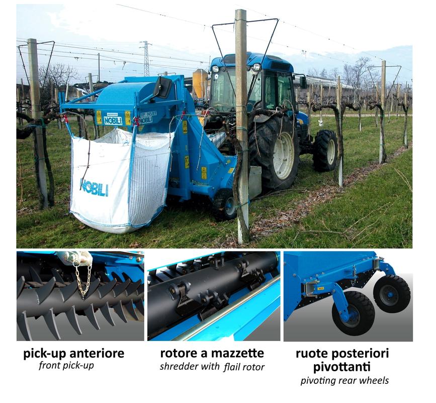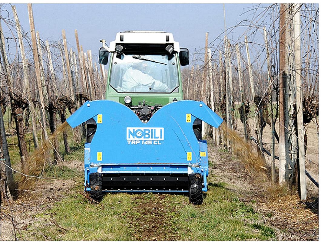 Cippatura e raccolta in campo. Una prima opzione è la raccolta dei residui di potatura, debitamente cippati, in sacchi di tessuto traspirante, idonei per l’essiccazione naturale del materiale, da destinare alla combustione a fini energetici. In tale contesto, la Nobili di Molinella (BO) offre i modelli della gamma di trituratrici TRP-RT, collegate all’attacco a 3 punti del trattore e semiportate con l’ausilio di un rullo o ruote di appoggio a terra. Le macchine sono dotate di idoneo pick-up (da 465 mm di diametro) che ruotando fino a 140 giri/min solleva selettivamente i frammenti di tralcio, escludendo erba, sassi e terra. Il rotore di trinciatura, anch’esso Ø 465 mm, gira a 2.600 giri/min ed è dotato da 14 a 24 mazze, in funzione della larghezza di lavoro, variabile nelle varie versioni tra 1,2 a 1,7 m circa. La potenza motore del trattore accoppiato aumenta di conseguenza, da 70 a 130 Cv. I sacchi in tessuto abbinabili sono da 0,8 m³ di volume , per una portata tipica di 200 kg di materiale. Il costruttore dichiara una capacità di lavoro tra 0,5 e 1 ha/h. L’adozione dei sacchi risulta vantaggiosa per la corretta essiccazione del materiale: se stoccato al riparo dalle precipitazioni atmosferiche, il processo fermentativo del cippato umido si interrompe al quarto giorno, preservando quindi dalla marcescenza il raccolto, che in idonee condizioni gradualmente riduce la propria umidità relativa dal 50% circa a meno del 10% in poco più di un mese.