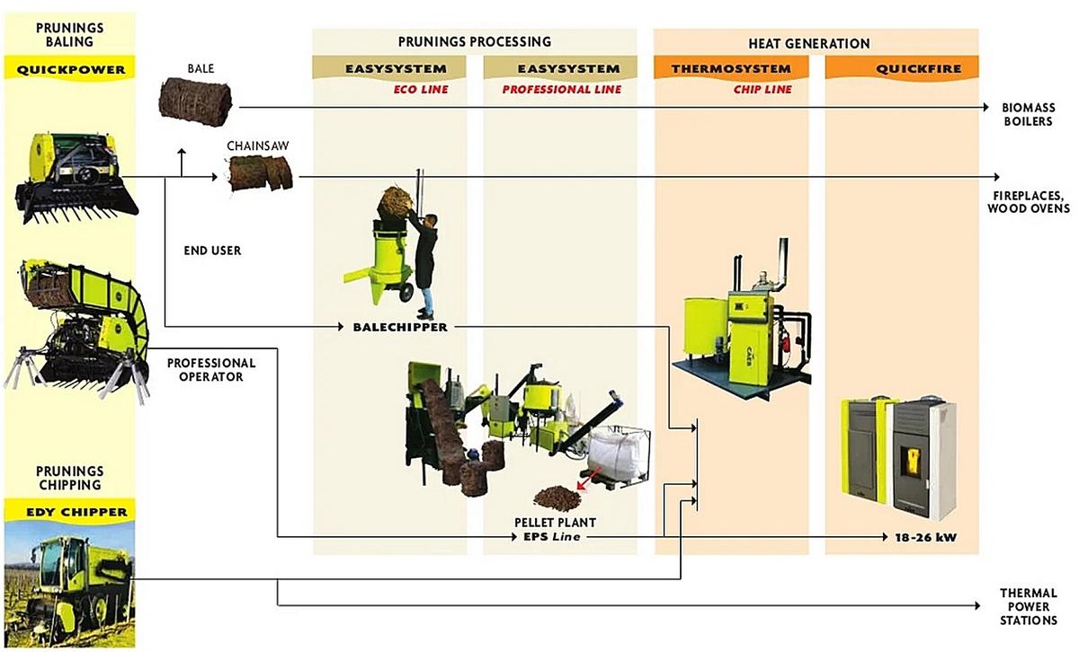 In tale ottica, anche i residui di potatura delle colture legnose hanno visto da qualche tempo il moltiplicarsi delle opportunità per il loro riutilizzo, e con esse il fiorire di attrezzature, o addirittura filiere di meccanizzazione, espressamente dedicate.