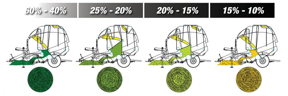 In altre situazioni, e in particolare quando il prodotto viene raccolto semiaffienato e successivamente fasciato con film plastico (per creare e poi mantenere opportune condizioni di anaerobiosi), è offerta la possibilità di realizzare balle di dimensioni variabili. In tal modo, nell’alimentazione quotidiana della mandria è possibile far consumare le singole rotoballe intere in un’unica soluzione e senza indesiderate rimanenze, a tutto vantaggio della qualità dell’alimento somministrato. Nel dettaglio, si tratta di un meccanismo a bilanciere, programmabile dal posto di guida per pre-impostare il diametro delle balle, tra soli 50 e 165 cm di diametro. La dimensione più opportuna può essere definita in base al tipo di foraggio e al suo contenuto d’acqua, in modo che le specie a più elevato valore aggiunto, quali la medica, possano essere imballate ad una minore pressione.