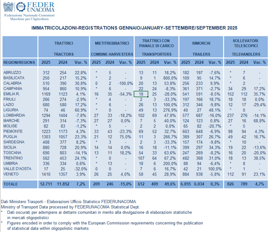Con la sola eccezione delle mietitrebbie (-15%), nei nove mesi tra gennaio e settembre le principali tipologie di macchine agricole registrano un incremento delle vendite, dopo le flessioni dell’ultimo decennio. Le trattrici crescono del 7,2%, i transporter del 49,6%, i sollevatori telescopici del 4,7%. Il Veneto con 1.410 macchine vendute è il primo mercato regionale. La domanda interna legata dagli incentivi statali