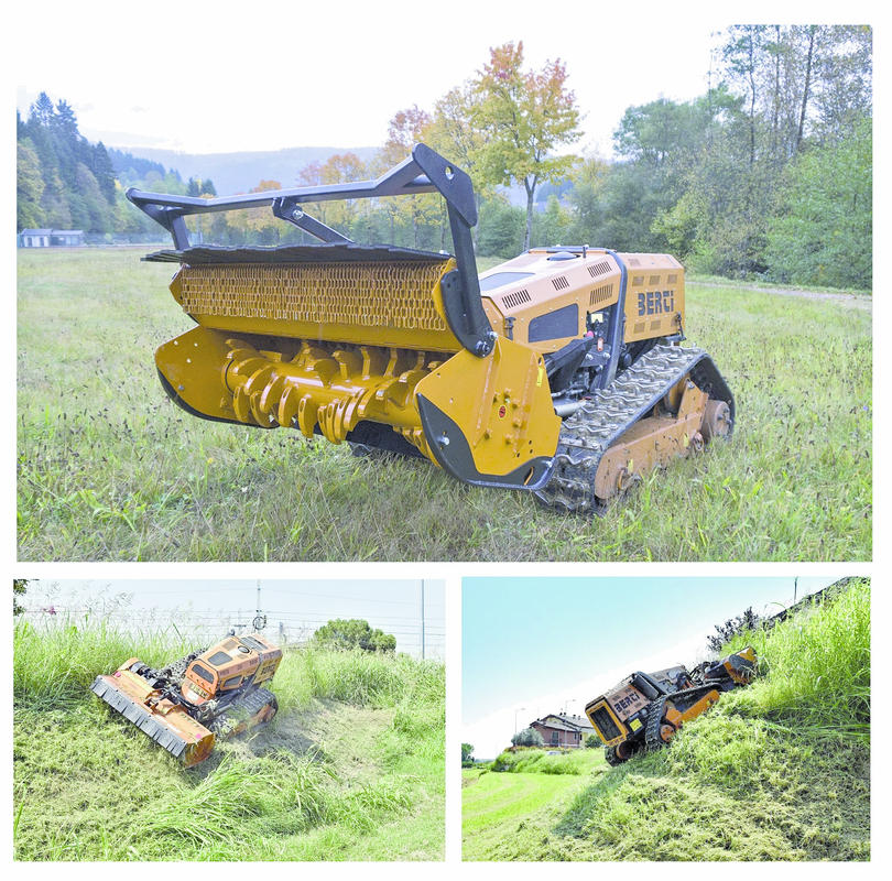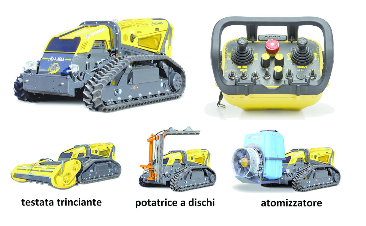 La Energreen di Cagnano (VI) produce la gamma Robo, ovvero mezzi anch’essi in grado di lavorare sino a 50-55° di pendenza in ogni direzione, con un raggio d’azione del radiocomando (che lavora a 870 MHz) di 150 m. Il modello RoboMAX, equipaggiato con un motore diesel da 75 Cv e trasmissione idrostatica a due gamme (tra 0 e 2,5 e tra 0 e 5,5 km/h) è dotato di cingoli, di serie in gomma, oppure a richiesta anche in gomma con costole alte o in acciaio.