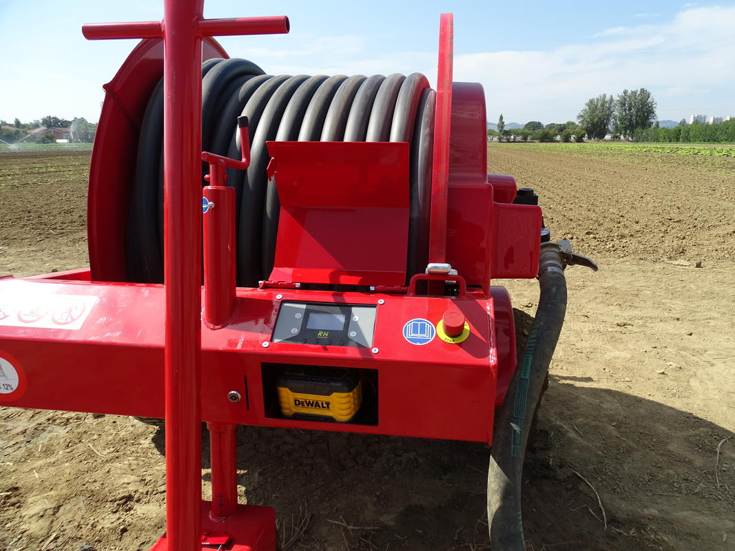 RM pensa green. La casa parmense presenterà ad Agritechnica la nuova serie di macchine irrigatrici semoventi di piccola taglia eSpeedy: due nuovi modelli dotati di un sistema di riavvolgimento che sfrutta al 100% l’energia elettrica grazie a un motoriduttore alimentato da batterie e alla gestione elettronica dei parametri di irrigazione. Derivati dai modelli tradizionali con riavvolgimento a turbina/pistone, i nuovi eSpeedy mantengono la taglia e le dimensioni. Attualmente la gamma si compone di una macchina più piccola, E40, dotata di tubo di diametro di 40 mm e lunghezza di 130 m, dedicata in primis all’irrigazione di campi sportivi, e di una più grande, E50, dotata di tubo di diametro di 50 mm e lunghezza di 160 m, che rappresenta un punto di riferimento per agricoltori con piccole estensioni, orticoltori e bio farmer. Entrando nel dettaglio, i nuovi eSpeedy sono equipaggiati con un motoriduttore elettrico a trasmissione pignone-cremagliera per ottimizzare l’efficienza del sistema. Il motore è alimentato da una sola batteria da 18V Li-ION per elettroutensile, intercambiabile e facilmente trasportabile. Secondo RM, la batteria rappresenta il punto di forza dell’intero progetto poiché garantisce la massima flessibilità e praticità di utilizzo, visto che consente il completamento dell’intero ciclo di irrigazione. La macchina è fornita con due batterie e l’apposito caricatore a carica rapida, in modo da avere sempre una batteria al lavoro e una in carica. Il sistema è brevettato e rappresenta un vantaggio rispetto alle soluzioni che si affidano alla ricarica con pannelli solari, garantendo sempre la massima potenza elettrica anche in condizioni di scarsa luminosità o nelle ore notturne. La gestione elettronica è affidata a una centralina che permette di regolare la velocità di riavvolgimento tra 0 e 60 m/h, di eseguire una pausa finale prima di arrestare il sistema chiudendo la valvola elettrica (opzionale) e di arrestare la macchina in caso di mancanza di pressione dell’acqua. La centralina è stata progettata privilegiando affidabilità e massima semplicità di utilizzo, ed è protetta da un carter metallico con serratura e resistente all’acqua. Grazie al sistema di riavvolgimento elettrico, la macchina può lavorare anche in condizioni di bassissima pressione dell’acqua, essendo azzerate le perdite di carico classiche dei sistemi a turbina. Rm evidenzia inoltre il miglioramento meccanico dell’entrata dell’acqua nella bobina grazie a una soluzione derivata dai modelli di taglia più grande. Soluzione che prevede il montaggio su cuscinetti e l’imboccatura dotata di boccola in acciaio Inox e anello di tenuta a labbro: in tal modo si previene qualsiasi perdita e si riducono al minimo gli interventi di manutenzione. Oltre alla già citata valvola elettrica di chiusura acqua, sono diversi gli accessori disponibili: carrello porta getto con ruote regolabili in larghezza, manichette, diversi tipi di irrigatori, ala piovana da 8 metri.