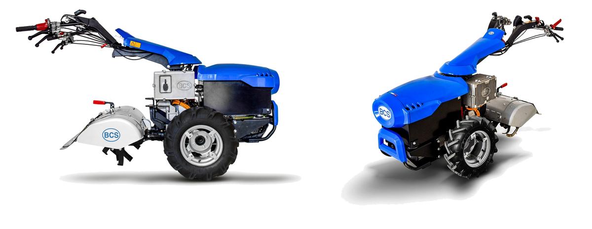 In questo panorama non particolarmente vivace, si distingue la BCS di Abbiategrasso (MI), che in occasione dell’ultima edizione di EIMA International ha presentato un modello di motocoltivatore full electric, denominato e-780, che è stato insignito del riconoscimento come Novità Tecnica. La macchina adotta una configurazione originale, con due motori elettrici, il primo da 1,5 kW dedicato alla trazione e l’altro da 3 kW per l’azionamento delle attrezzature accoppiate tramite la presa di potenza, per una potenza complessiva installata di 4,5 kW. Rispetto all’adozione di un unico propulsore che sopperisce a tutte le richieste, questa scelta progettuale è vantaggiosa, poiché in tal modo è possibile rispondere adeguatamente alle necessità di un’utilizzazione senza penalizzare l’altra, tra l’altro con l’erogazione massima della coppia motrice a bassi regimi e per un ampio intervallo della velocità di rotazione dei due motori elettrici. L’e-780 di BCS ha un’autonomia variabile tra 1,5 e 4 ore circa, in funzione dell’impegno della lavorazione; il pacco batterie si ricarica in poco meno di 2 ore. Analogamente al suo “gemello” equipaggiato con motore endotermico, anche questo motocoltivatore di BCS ha una trasmissione a variazione continua, per velocità di avanzamento tra 0 e 5 km/h.