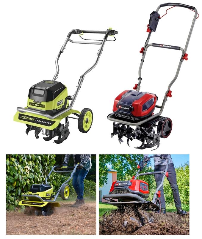 Viceversa, la scelta per ciò che concerne le motozappe elettriche è molto più ampia, anche se la gran parte dei modelli sono prettamente hobbystici, ovvero equipaggiati con motori di piccola potenza e battery pack standardizzati (spesso a 36 V) che possono essere utilizzati anche su altri attrezzi elettrificati. Di conseguenza, la capacità di lavoro, sia in termini di larghezza che di profondità è piuttosto limitata. I modelli (semi) professionali sono molto meno numerosi: Ryobi ad esempio propone il modello RY36CVXA-0, con una larghezza di lavoro fino a 40 cm e una profondità massima (dichiarata) di 20 cm. è possibile impiegare batterie sino ad una capacità di 12 Ah, con un’autonomia che il produttore afferma essere sufficiente per lavorare 300 m². Anche la tedesca Heinhell offre diversi modelli di motozappa elettrica, sempre alimentate con battery pack agli ioni di Litio a 36 V di tensione. Il modello GP-CR 36/45 è dotato di 24 zappette disposte su 6 ranghi, ha larghezza di lavoro di 45 cm e può lavorare – secondo il produttore – sino a 20 cm di profondità.