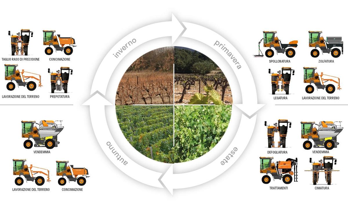 Nel panorama dei portattrezzi è doveroso includere anche l’evoluzione della vendemmiatrice che, nella versione semovente, si è da tempo trasformata in un vero e proprio telaio multifunzione motorizzato. Le aziende leader di mercato si sono già ampiamente mosse in tal senso; ne è un esempio la gamma Optimum di Pellenc, i cui modelli sono in grado di svolgere le principali lavorazioni nel vigneto montando in alternativa i moduli dedicati, riconosciuti in automatico tramite la funzione “easy connect”. Il vantaggio della flessibilità delle lavorazioni si aggiunge alle peculiarità della parte semovente della macchina, come ad esempio l’angolo di sterzata di ben 95°.
