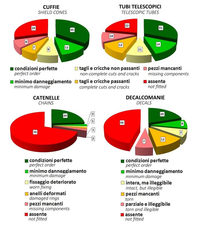 I risultati mostrano un’evoluzione moderatamente positiva delle condizioni generali delle protezioni degli alberi cardanici, anche se perdurano numerose importanti criticità. I principali elementi della protezione sono stati in questa occasione classificati in 6 categorie ad idoneità decrescente, dalla completa integrità alla totale mancanza, considerando tra queste solo le prime due come positive (ovvero: “condizioni perfette” e “minimo danneggiamento”), valide quindi per assicurare un sufficiente livello di sicurezza operativa. In tale contesto, nemmeno la metà delle cuffie (47%) e dei tubi (45%) sono sicuri, mentre il 70% delle catenelle di ritenzione continua ad essere assente e quasi 3/4 (72%) delle decalcomanie di avvertimento risulta di fatto illeggibile, per svariati motivi.