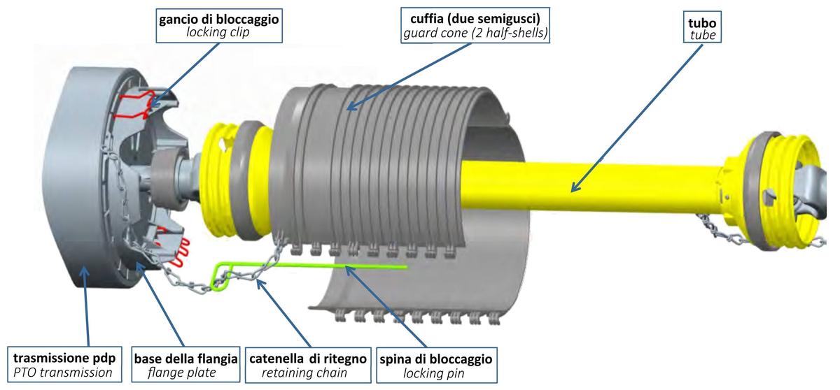 Per limitare il rischio, tale dispositivo deve essere pertanto integralmente segregato, con una protezione che ne impedisca il contatto accidentale (soprattutto quando l’albero è in rotazione), e che solitamente è composta da diversi elementi (di base: cuffie e tubi) collegati tra loro e fissati all’albero cardanico con opportuni cuscinetti di strisciamento.