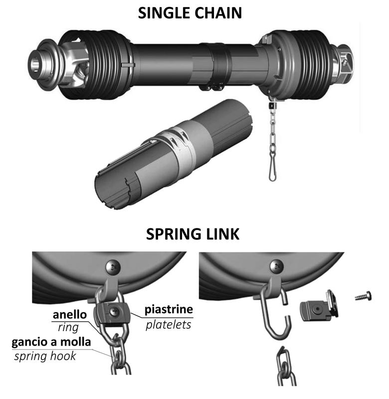In tal modo, i due tubi della protezione sono liberi di scorrere assialmente durante le normali variazioni di lunghezza dell'albero, ma non di ruotare l’uno rispetto all'altro. Di conseguenza, per impedire la rotazione della protezione antinfortunistica è sufficiente una sola catenella, posta sull’estremità operatrice (da qui la denominazione “Single Chain”).