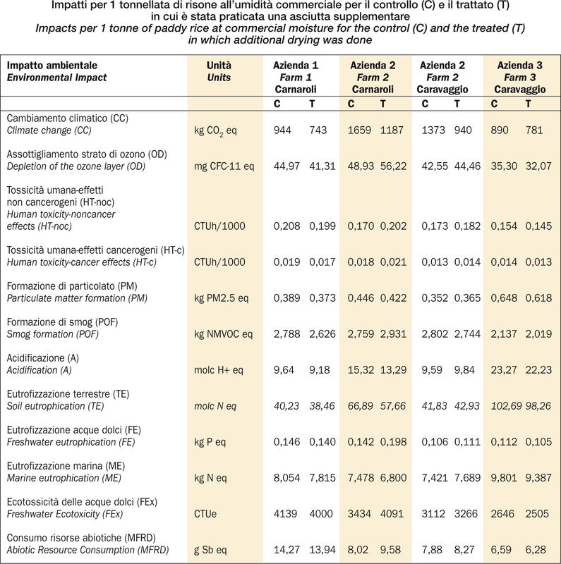 Le variazioni degli altri effetti ambientali dipendono principalmente dalla resa; occorre infatti ricordare che il metano causa impatti solo per l’impronta di carbonio e per la formazione di smog (POF). Nel caso del Carnaroli nell’azienda 2, il sensibile calo produttivo causa un non trascurabile aumento di impatto per OD (+13%), HT-noc (+16%), HT-c (+13%), POF (+6%), FE (+28%), FEx (16%) e MFRD (+16%). È interessante però notare come nel Carnaroli nell’azienda 1 e nel Caravaggio nell’azienda 3 la soluzione con un’asciutta aggiuntiva consenta di ridurre non solo l’impronta di carbonio, ma anche tutti gli altri impatti ambientali.