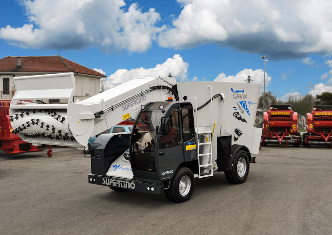 Nella seconda categoria si possono citare alcuni sollevatori telescopici o i più comuni carrelli elevatori, ma anche il nuovo ed efficiente carro trincia-miscelatore semovente Electra 21 di Supertino, presentato anche all’ultima edizione di Agrilevante a Bari, che ha riscosso davvero molto interesse tra i visitatori. Si tratta di una macchina con cassone da 21 m3 e con due coclee verticali per la trinciatura e la miscelazione, che garantisce un paio d’ore di operatività e necessita di tempi di ricarica di circa 3 ore. Questi “numeri” rappresentano una soluzione più che congrua per le stalle di dimensioni medio-grandi, e che nella gestione risulta essere più economica rispetto ad un analogo modello convenzionale.